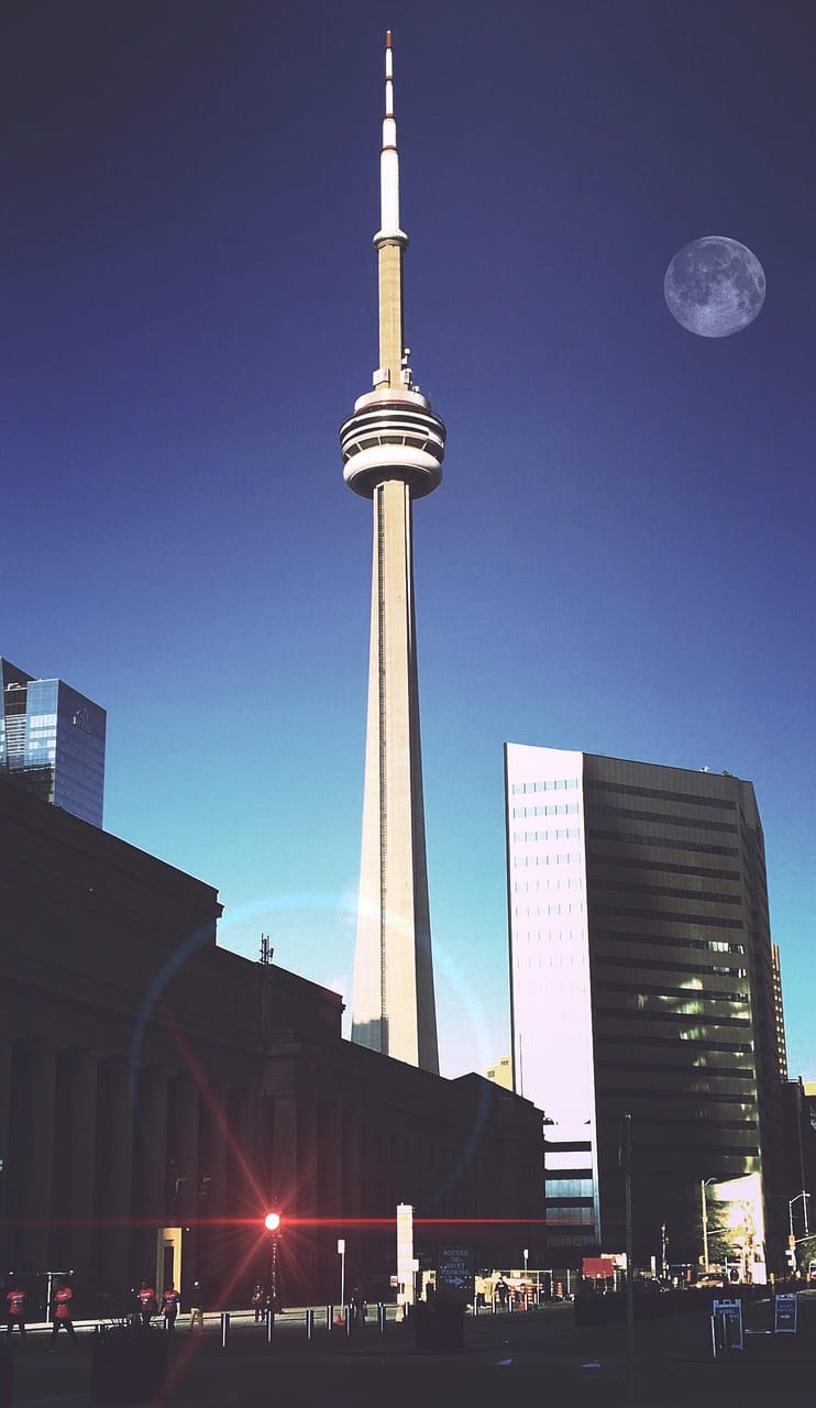 The CN Tower is a tall tower in Toronto, Canada. It's one of the tallest buildings in the world. People can go up to the top and see a beautiful view of the city and Lake Ontario. It has a glass floor, so visitors can look straight down!